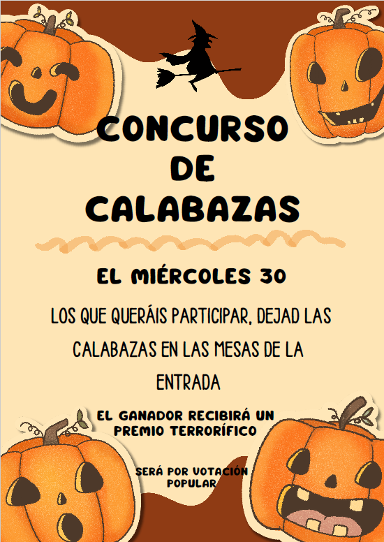 Concurso de calabazas Publicada el 28 octubre, 20244 noviembre, 2024 por Departamento de Lengua y Literatura El día 30 todos los alumnos están invitados a decorar el centro de forma “halloweeniana”. Traerán calabazas diseñadas por ellos y toda la comunidad educativa votará por la mejor: la más terrorífica, la mejor diseñada y la mejor elaborada.